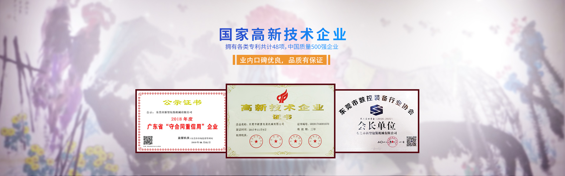 新望機(jī)械成立于1998年,位于東莞市東部工業(yè)園區(qū)的中心地帶——企石鎮(zhèn)東平村,交通方便、環(huán)境優(yōu)美舒適、視野開闊。公司注冊(cè)資本2000萬(wàn)元,擁有辦公室、廠房等18,000多平方米。已通過ISO9001:2015國(guó)際質(zhì)量管理體系認(rèn)證,擁有國(guó)家各類專利共計(jì)58項(xiàng)。是東莞市企石鎮(zhèn)工商聯(lián)副會(huì)長(zhǎng)單位、東莞市企石鎮(zhèn)文學(xué)藝術(shù)界聯(lián)合會(huì)副主席單位、東莞市環(huán)保包裝行業(yè)協(xié)會(huì)副會(huì)長(zhǎng)單位、東莞市數(shù)控裝備行業(yè)協(xié)會(huì)第二屆會(huì)長(zhǎng)單位、廣東省包裝技術(shù)協(xié)會(huì)常務(wù)理事單位、廣東省膠粘劑行業(yè)協(xié)會(huì)理事單位、廣東省著名商標(biāo)企業(yè)、國(guó)家高新技術(shù)企業(yè)。